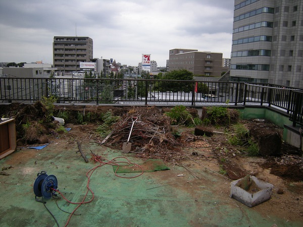 3階建ての屋上、つまり4階の高さに備わっていた陶器プランター植木鉢一式の撤去と処分を承りました。